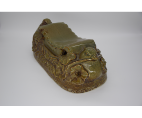 此瓷枕體型碩大,最下刻池水紋然後刻牡丹花紋。鴛鴦形象逼真可愛,底部有火石紅,整體造型優美,古樸典雅,規整大方,寓意鴛鴦戲水,鴛鴦雙飛的美滿幸福的婚姻生活。是一件難得的宋代青瓷系列中的重器!
