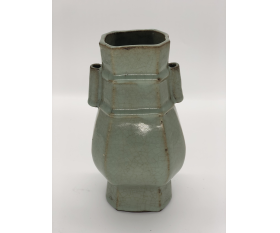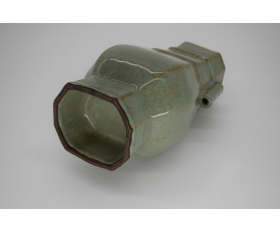 這只官窯貫耳瓶,形制採用的是仿古代青銅器投壺的造型。古代文人們經常使用投壺這種遊戲形式,進行競技和鬥酒。投壺一般都是青銅器製作,宋代的工匠將青銅器造型應用到瓷器生產當中,生產了這種貫耳瓶。這只貫耳瓶兩側的有筒狀貫耳,可以穿繩。瓶身採用直口闊腹的形式,並且形成了竹節狀。通身佈滿的天青色釉彩和自然開片,使得這只官窯貫耳瓶,顯得非常的古樸典雅。由於存世量極少,保存非常完整,包漿十分自然,有著極高的收藏和經濟價值。