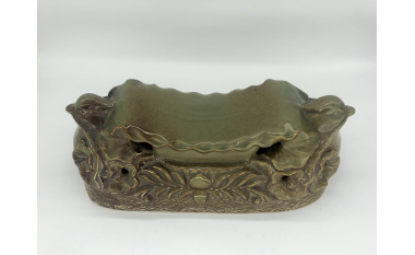 此瓷枕體型碩大,最下刻池水紋然後刻牡丹花紋。鴛鴦形象逼真可愛,底部有火石紅,整體造型優美,古樸典雅,規整大方,寓意鴛鴦戲水,鴛鴦雙飛的美滿幸福的婚姻生活。是一件難得的宋代青瓷系列中的重器!